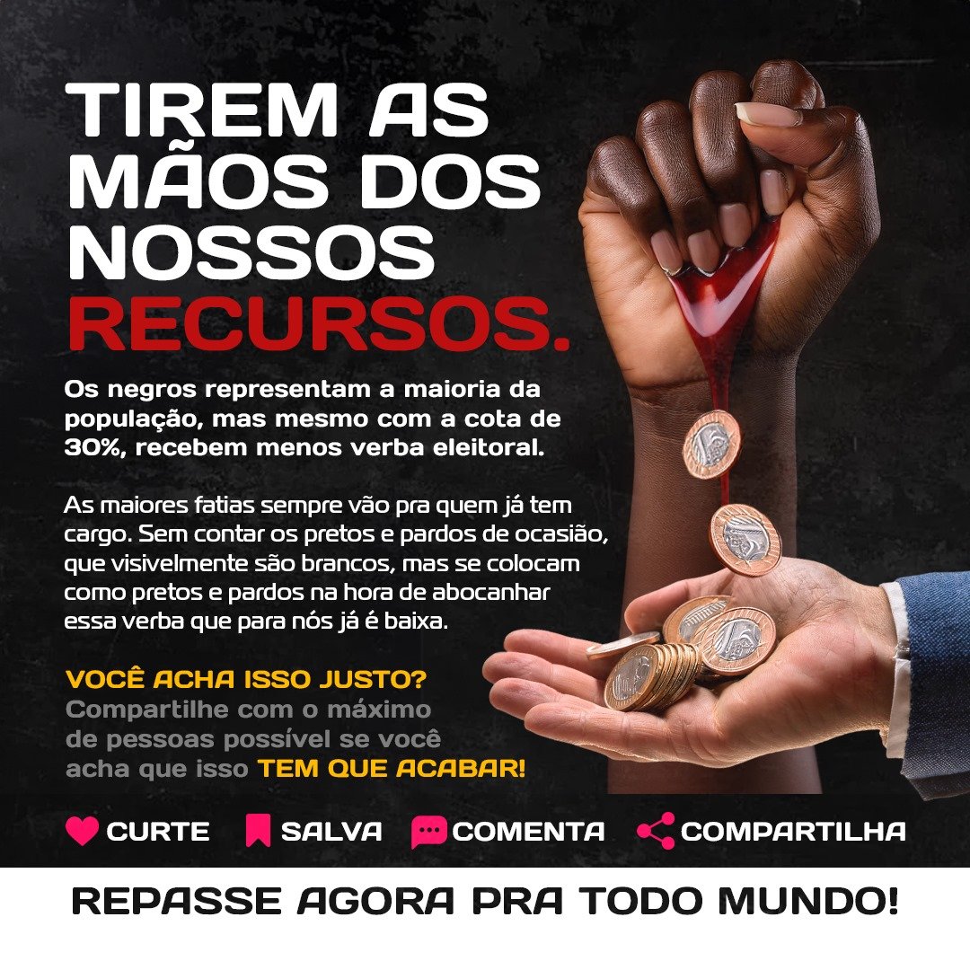As maiores fatias sempre vão pra quem já tem cargo. Sem contar os pretos e pardos de ocasião, que visivelmente são brancos, mas se colocam como pretos e pardos na hora de abocanhar essa verba que para nós já é baixa. VOCÊ ACHA ISSO JUSTO?
